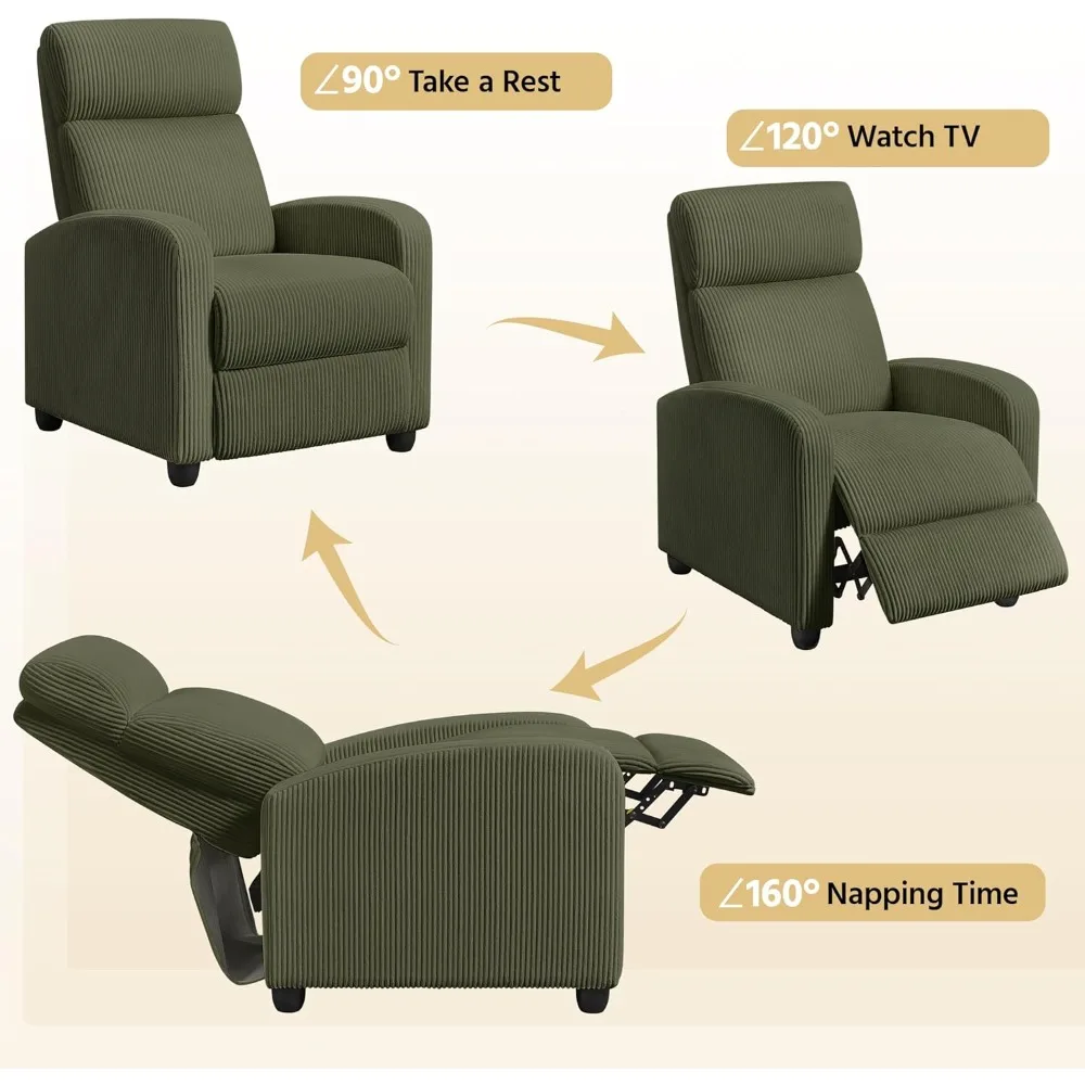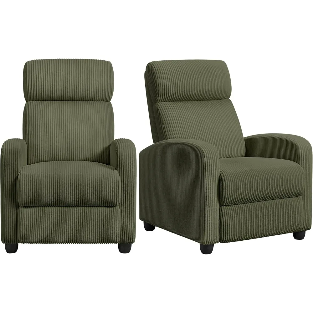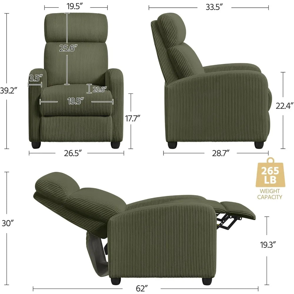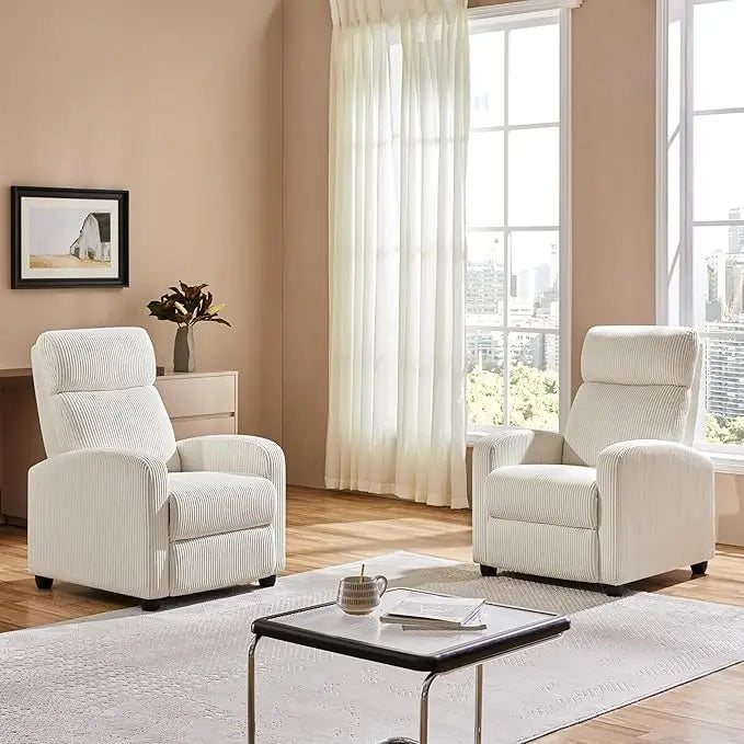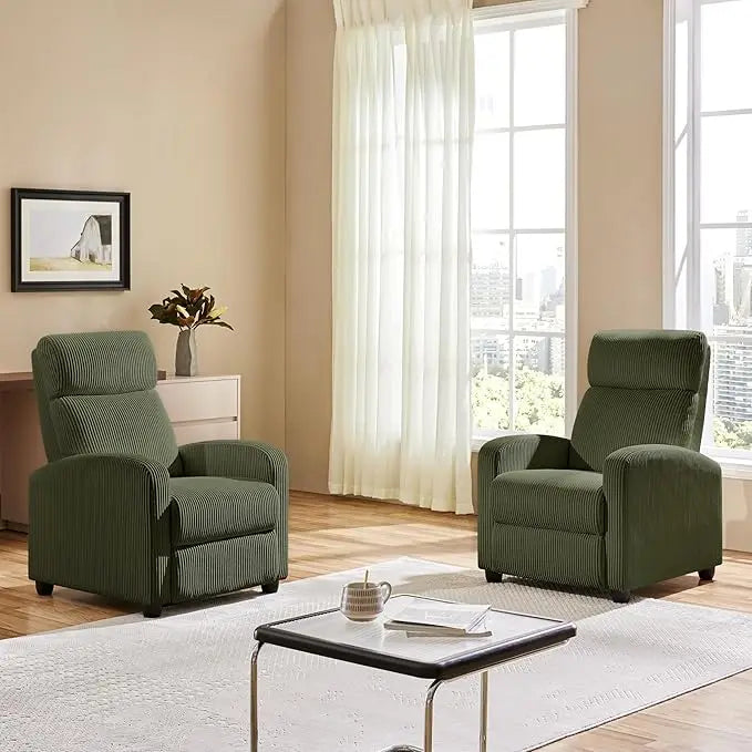 - Strong Build & Soft Fabric: Built with solid engineered wood frames and covered in soft corduroy, this set of two recliners provides utmost comfort and durability, each chair supporting up to 265 lb