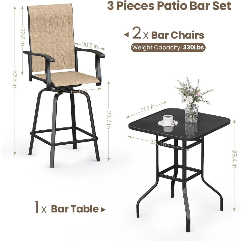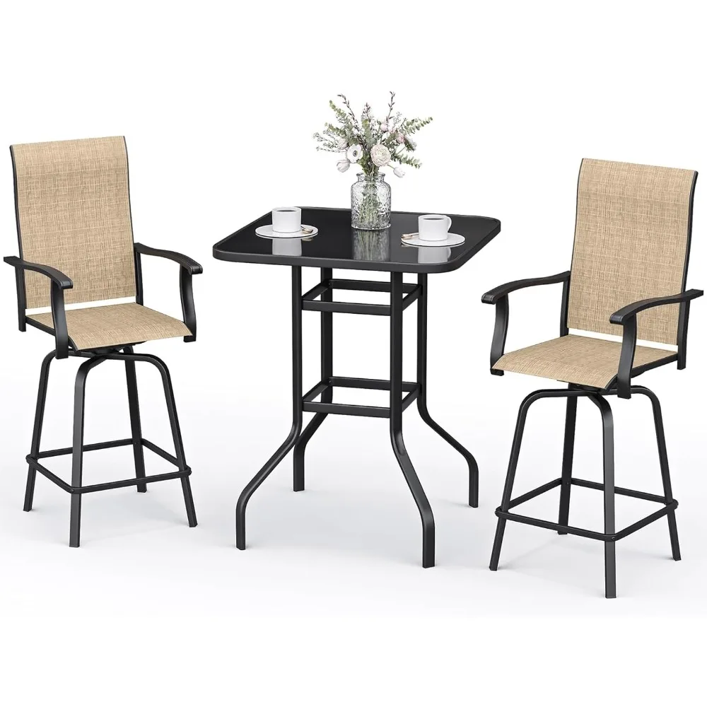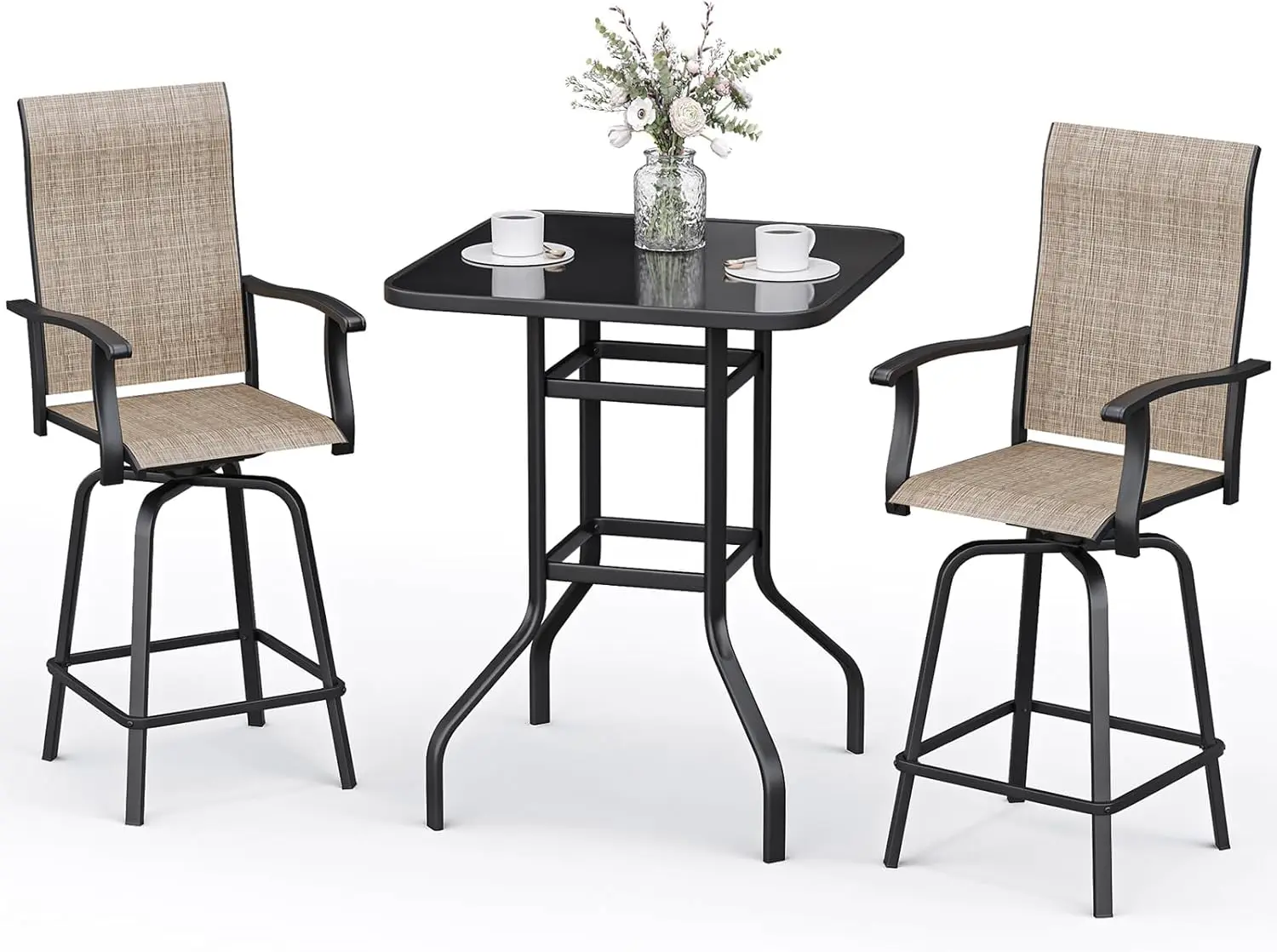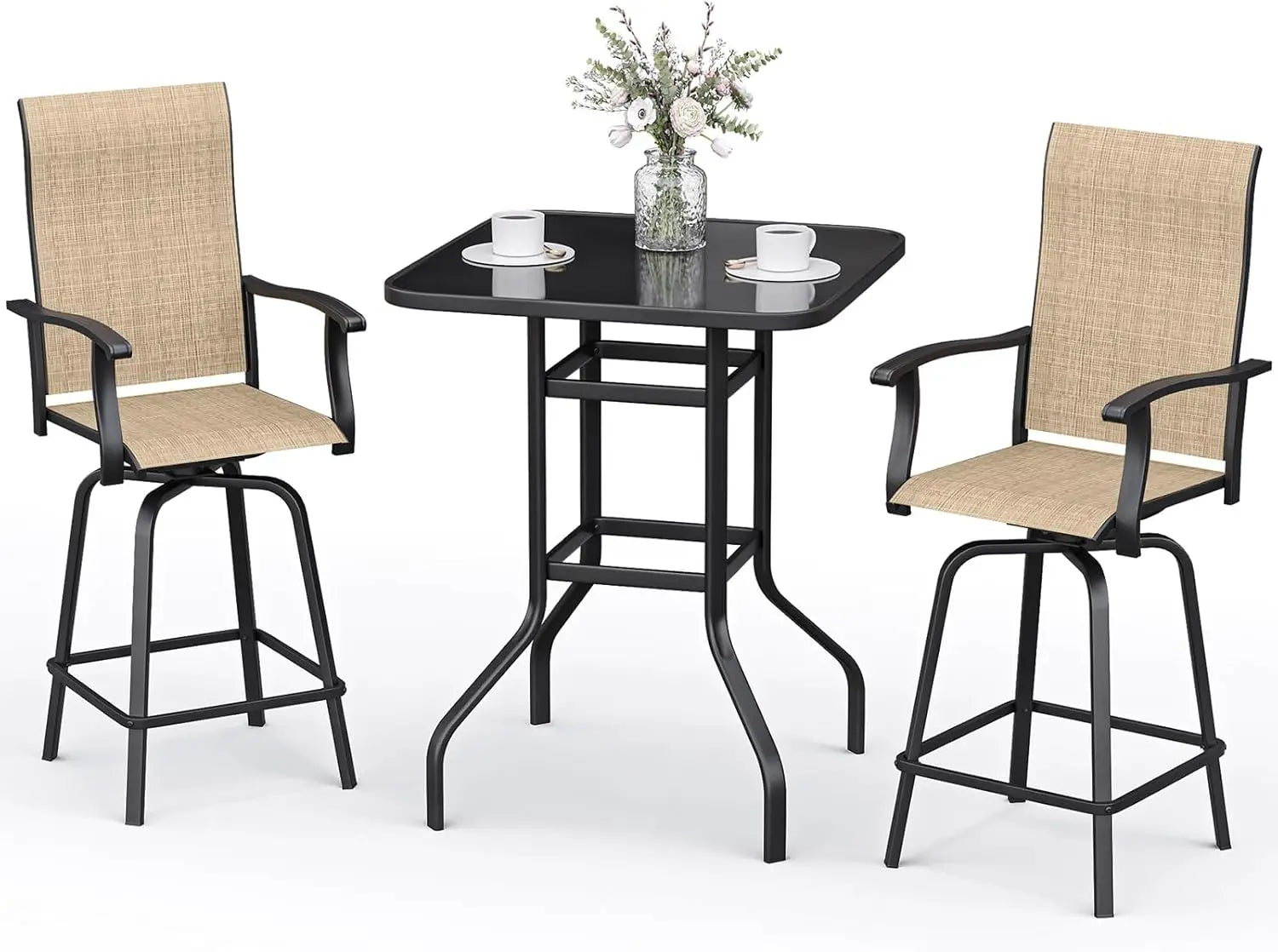 3-Piece Patio Bar Set with Textilene Swivel Bar Stools, All-Weather Bar Height Tempered Glass Table and Chairs for Lawn, Garden
