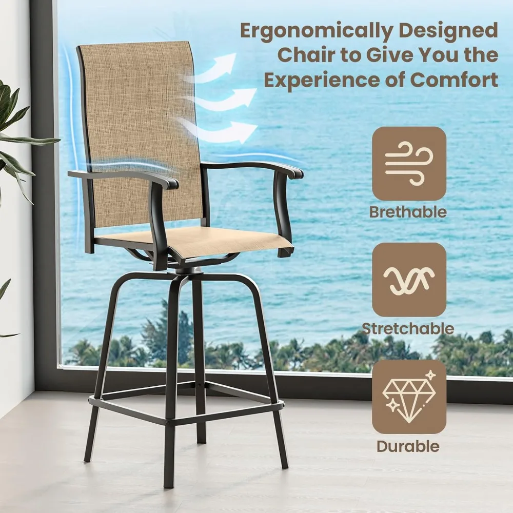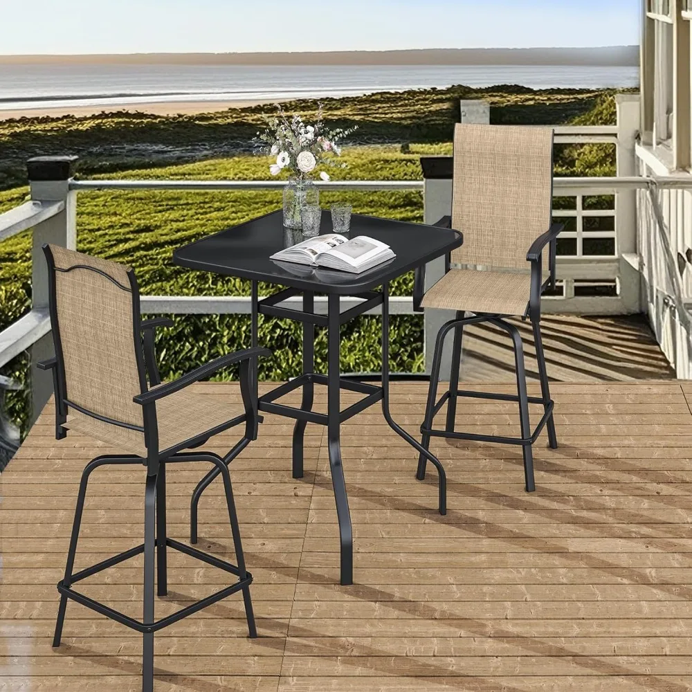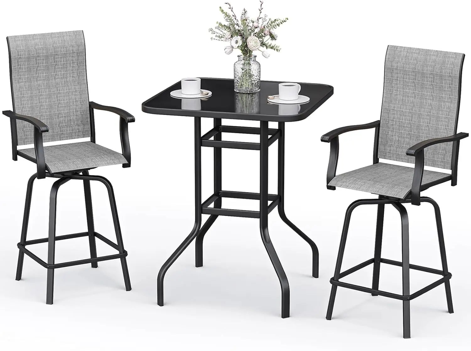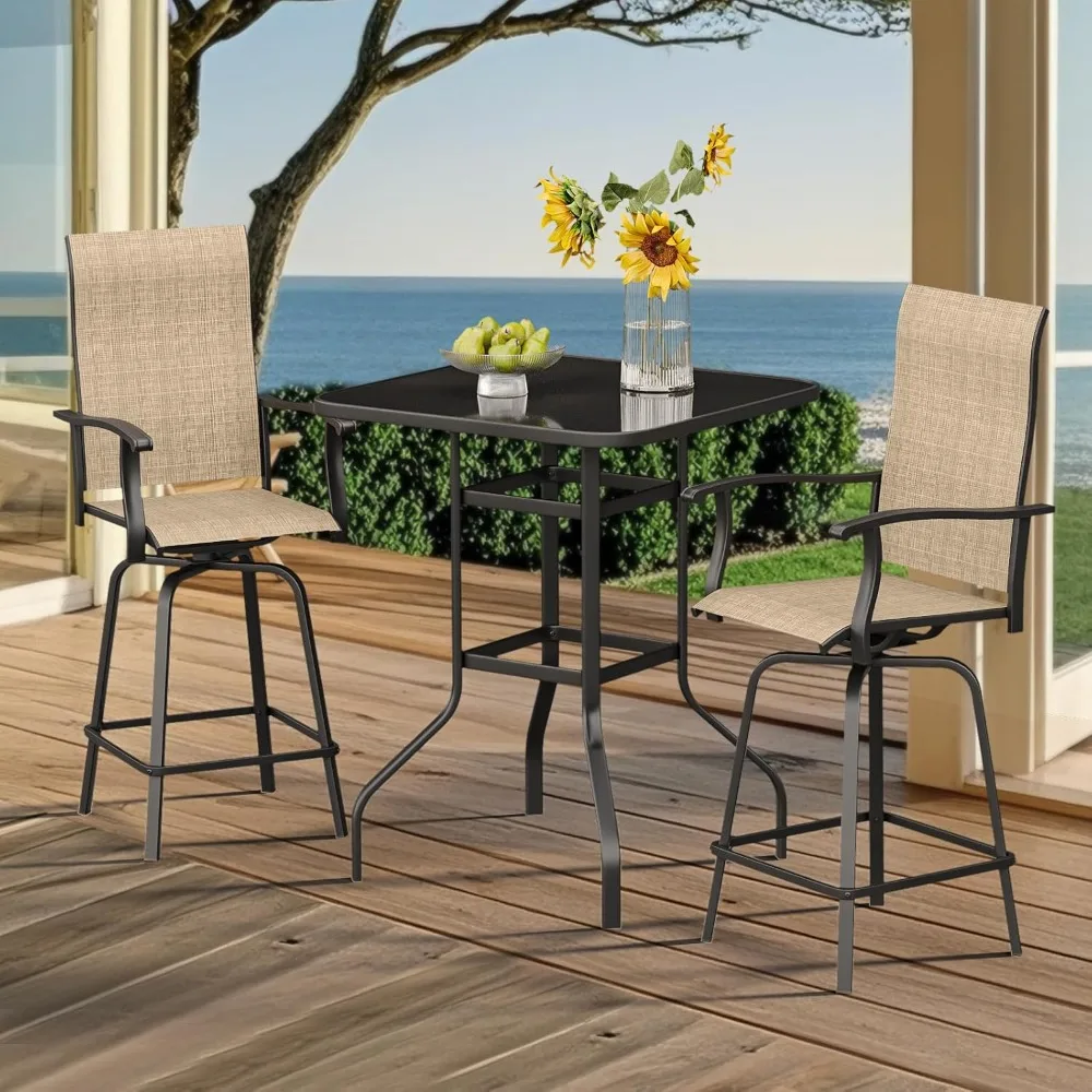 3-Piece Patio Bar Set with Textilene Swivel Bar Stools, All-Weather Bar Height Tempered Glass Table and Chairs for Lawn, Garden