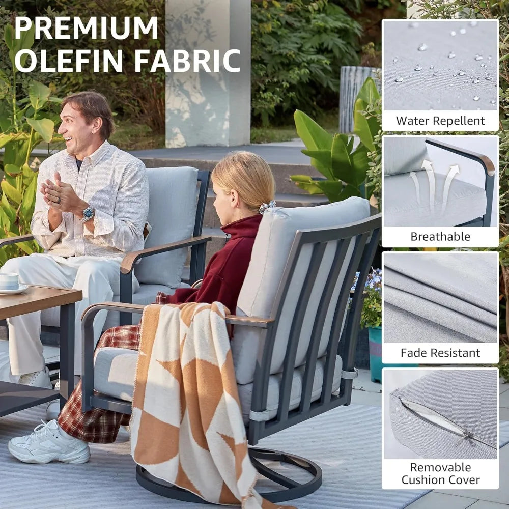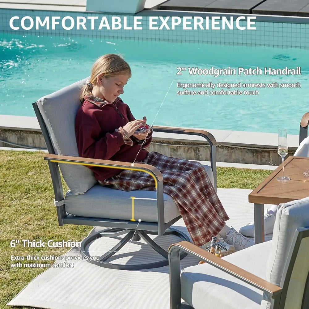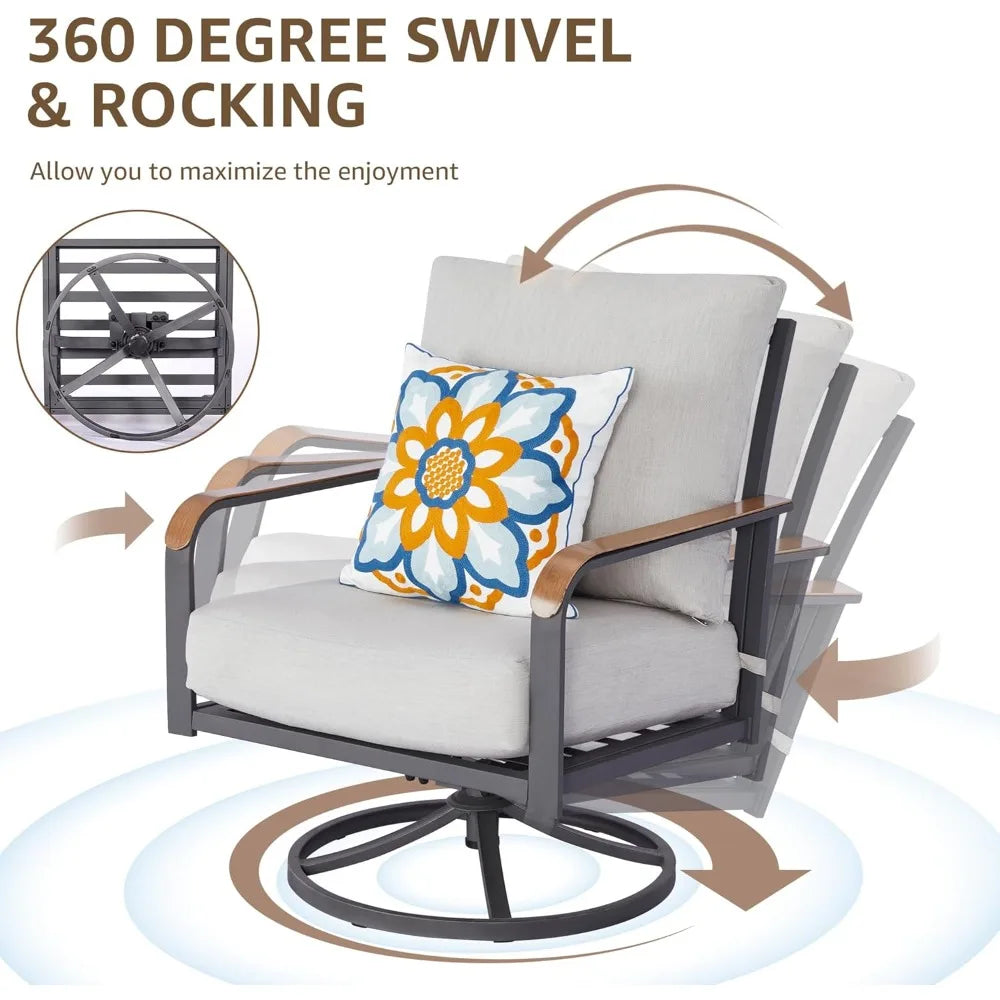 • 【Stylish & Versatile】This 5-piece set includes 4 rotating rocking chairs, a square table, and seamlessly blends style and function. The modern and timeless design enhances any patio, balcony or garden setting, making it a must-have for outdoor relaxation.