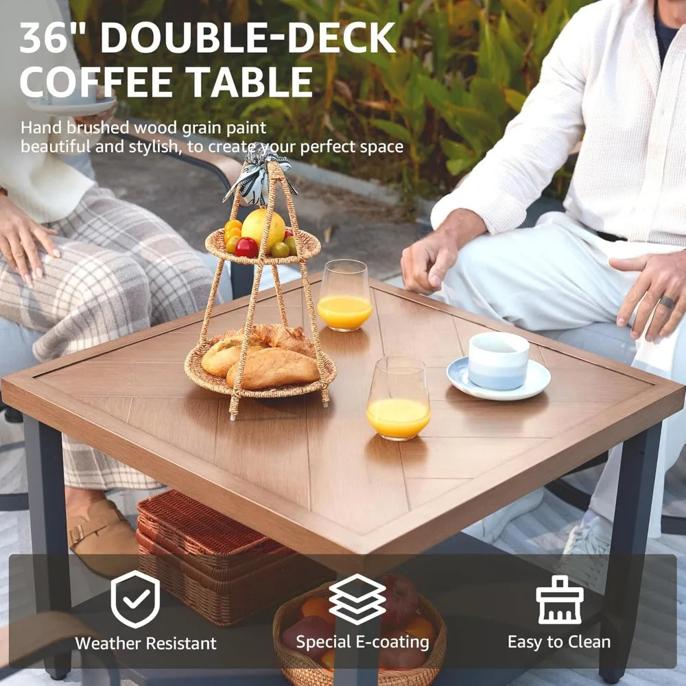 • 【Imitation wood handmade surface treatment】 The surface of the square table is coated with imitation wood veneer, which is beautiful and natural, and perfectly integrates with the outdoor environment. The 36-inch square table can hold your and your family's favorite desserts and drinks, and the double-decker design is beautiful and functional. The overall frame is galvanized to effectively prevent rust, scratches, rain and UV damage.