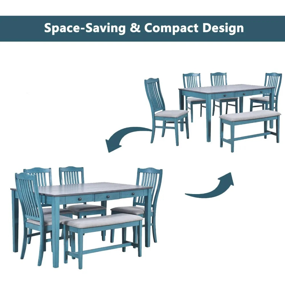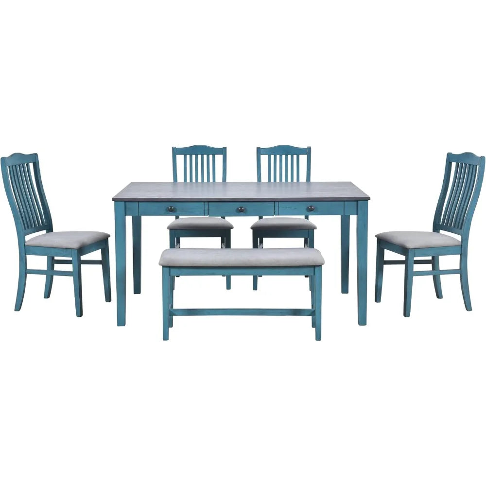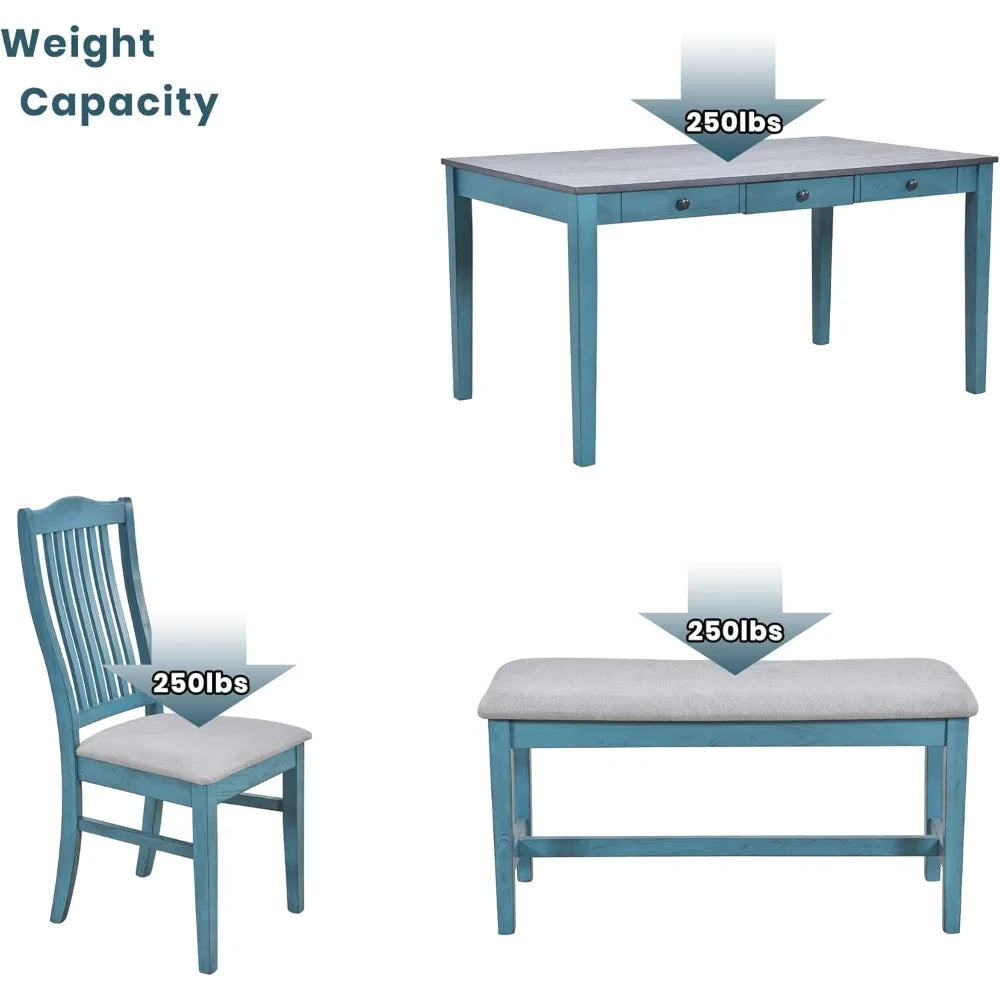 6 Piece Solid Wood Dining Table Set, Farmhouse Kitchen Table Set with 4 Upholstered Chairs, Bench and Storage Drawers, Antique
