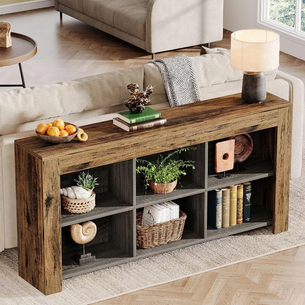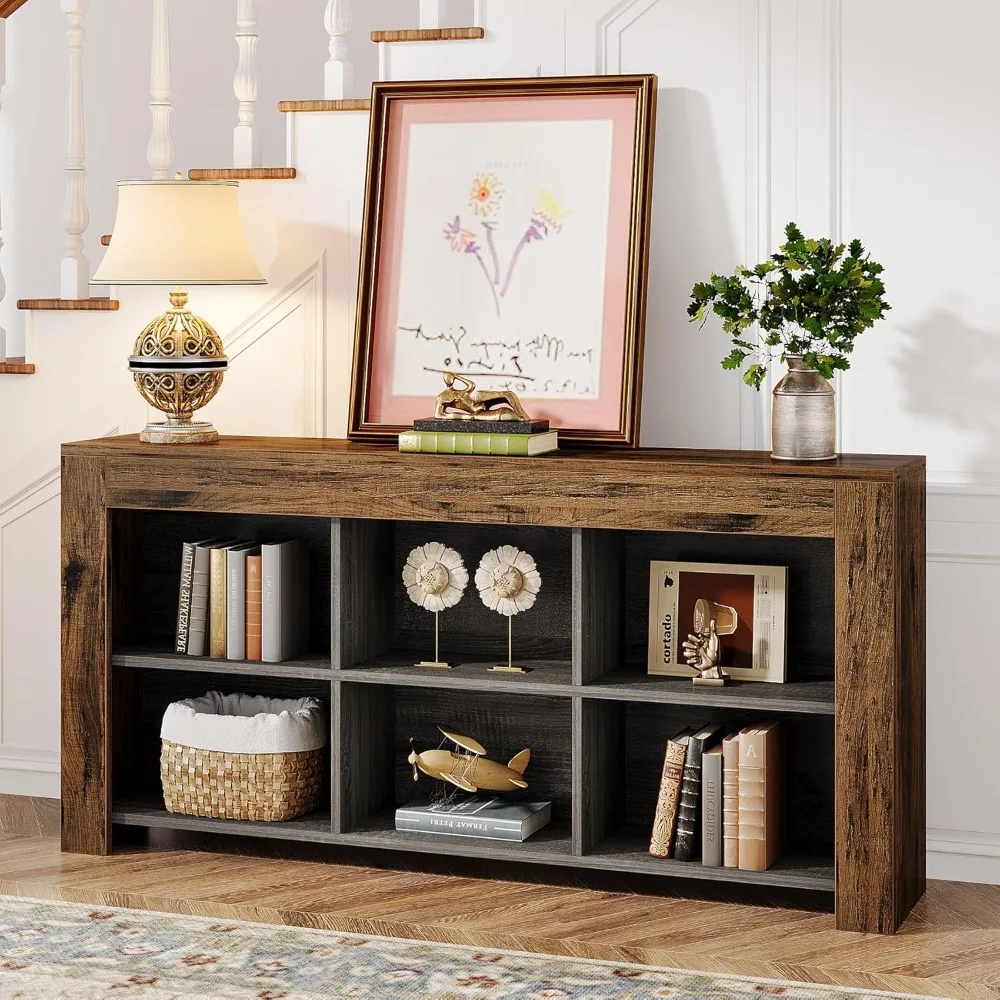 63-Inch Long Console Table, Rustic Wood Entryway Table with 6 Storage Cubes, Industrial Narrow Sofa Table Behind Couch Table