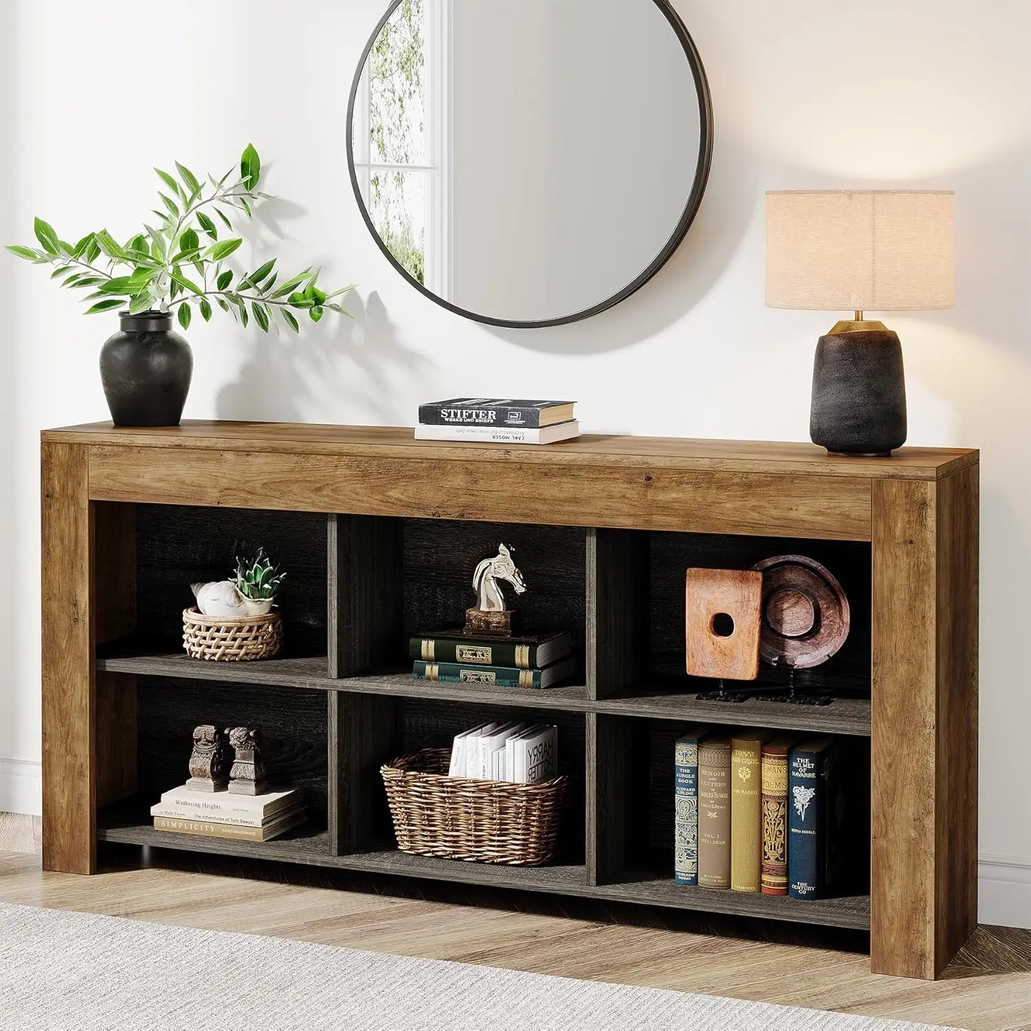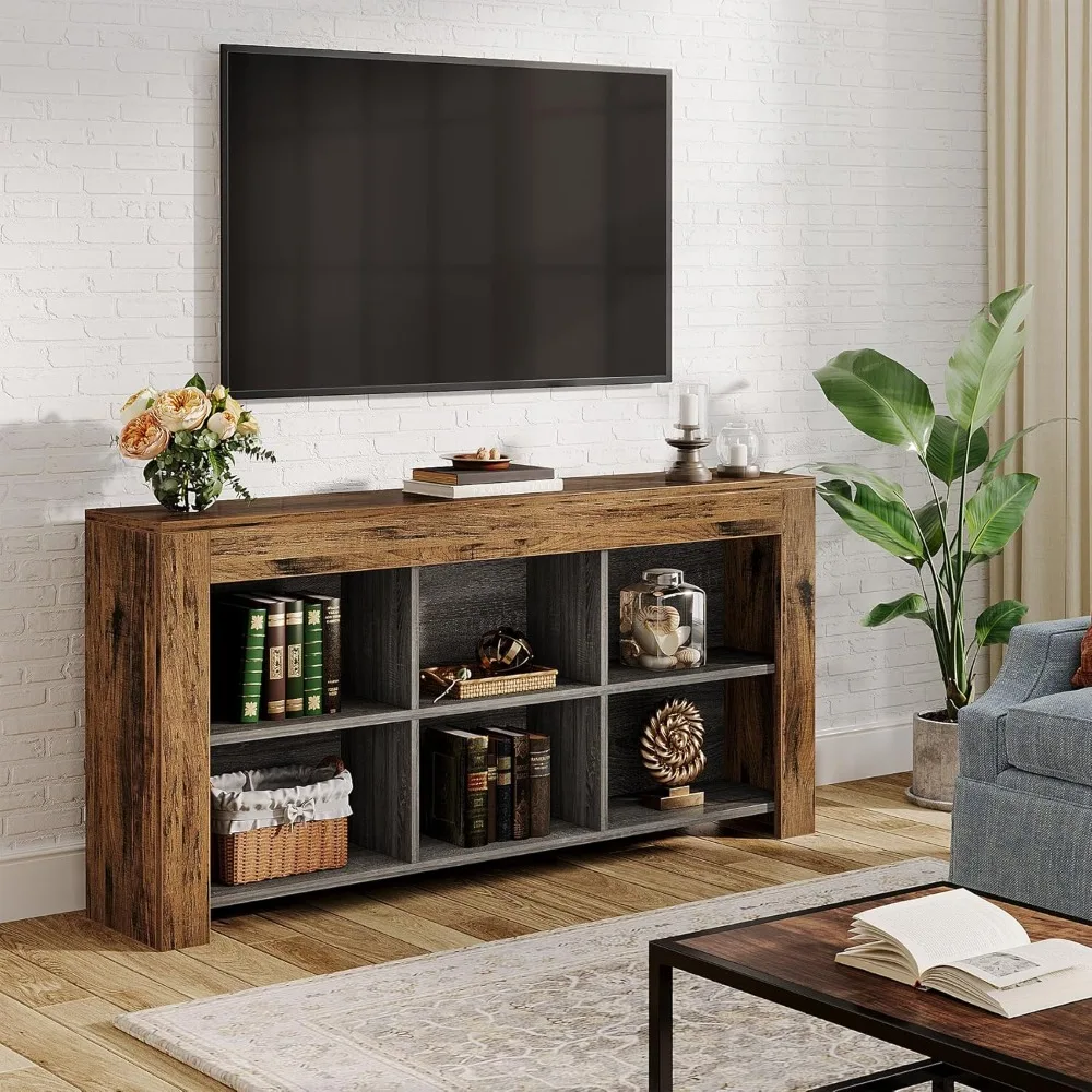 • [Ample Storage Space]: With a generous 63" L x 11.81" W tabletop, this wood console table offers ample space to store your handy items or display cherished decorations. The 6 open storage compartments provide abundant space to keep your belongings organized and easily accessible.