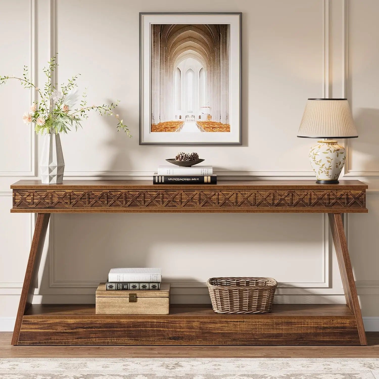 71-Inch Extra Long Console Table, 2-Tier Farmhouse Entryway Table with Bottom Shelf, Narrow Sofa Table Behind Couch, Wooden