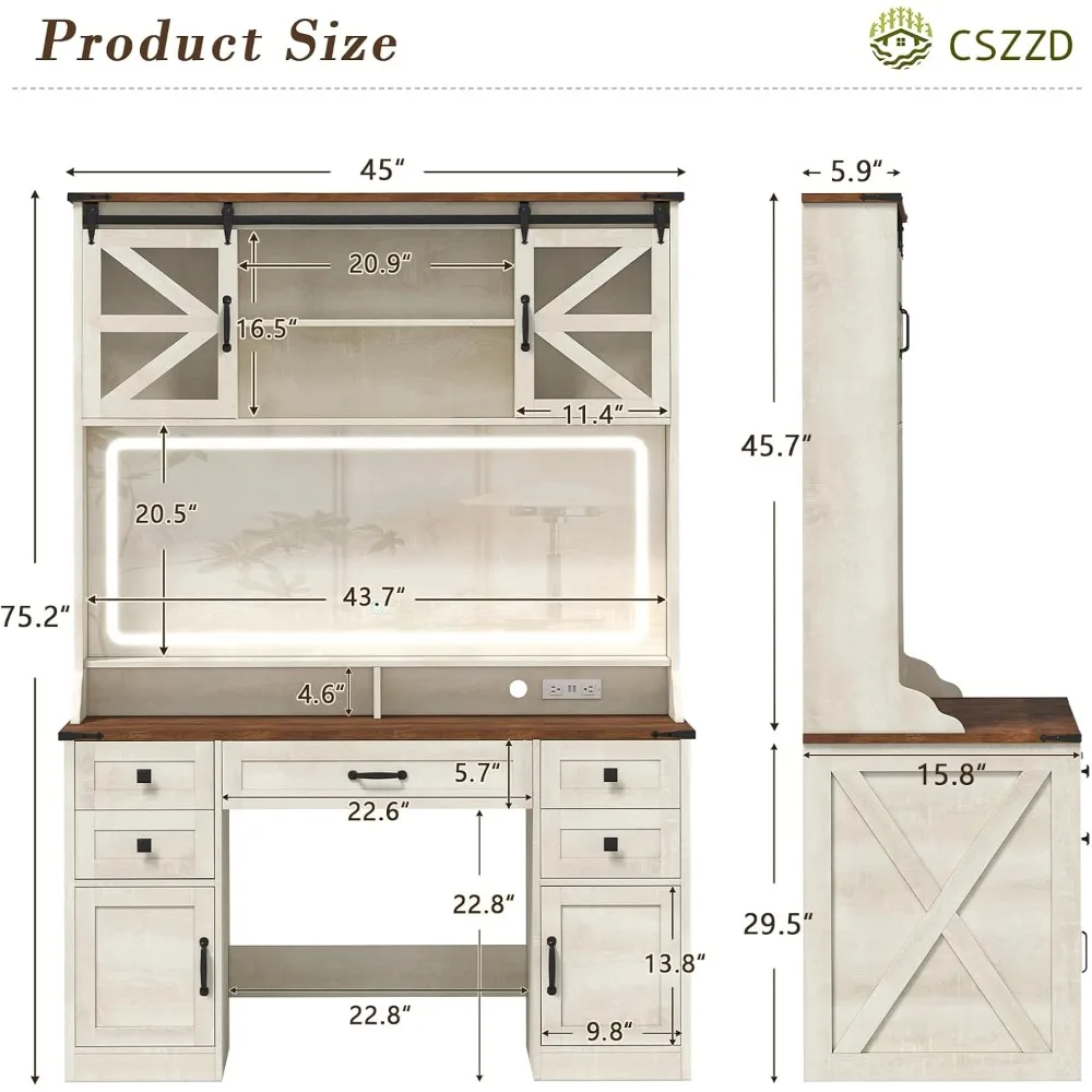 • 【Powerful Storage Capacity】Equipped with 2 sliding barn storage cabinet, 5 drawers and 2 side cabinet, open shelve and a spacious tabletop, this vanity desk have a great capacity for your cosmetics and jewelry, make your desktop more tidy and clean.