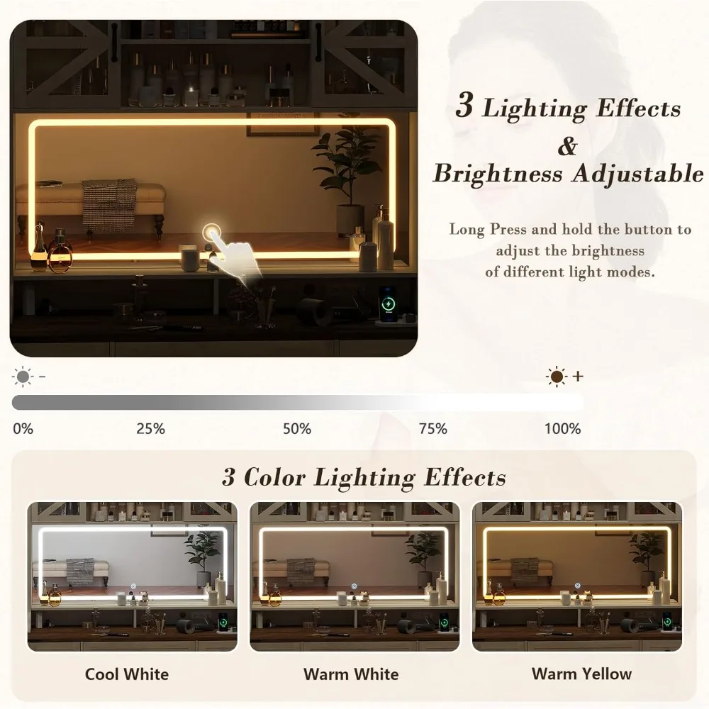 • 【Large HD Mirror with 3 Lighting Modes】 Makeup vanity comes with a large 43.7" x 20.5" HD mirror, which can be easily switched between three modes of warm, natural and cool colors at the touch of a switch in the center of the mirror, and a long press on the switch can also adjust the brightness to suit different scenarios and makeup needs. It is definitely a dream gift for all men's wives, daughters and mothers.