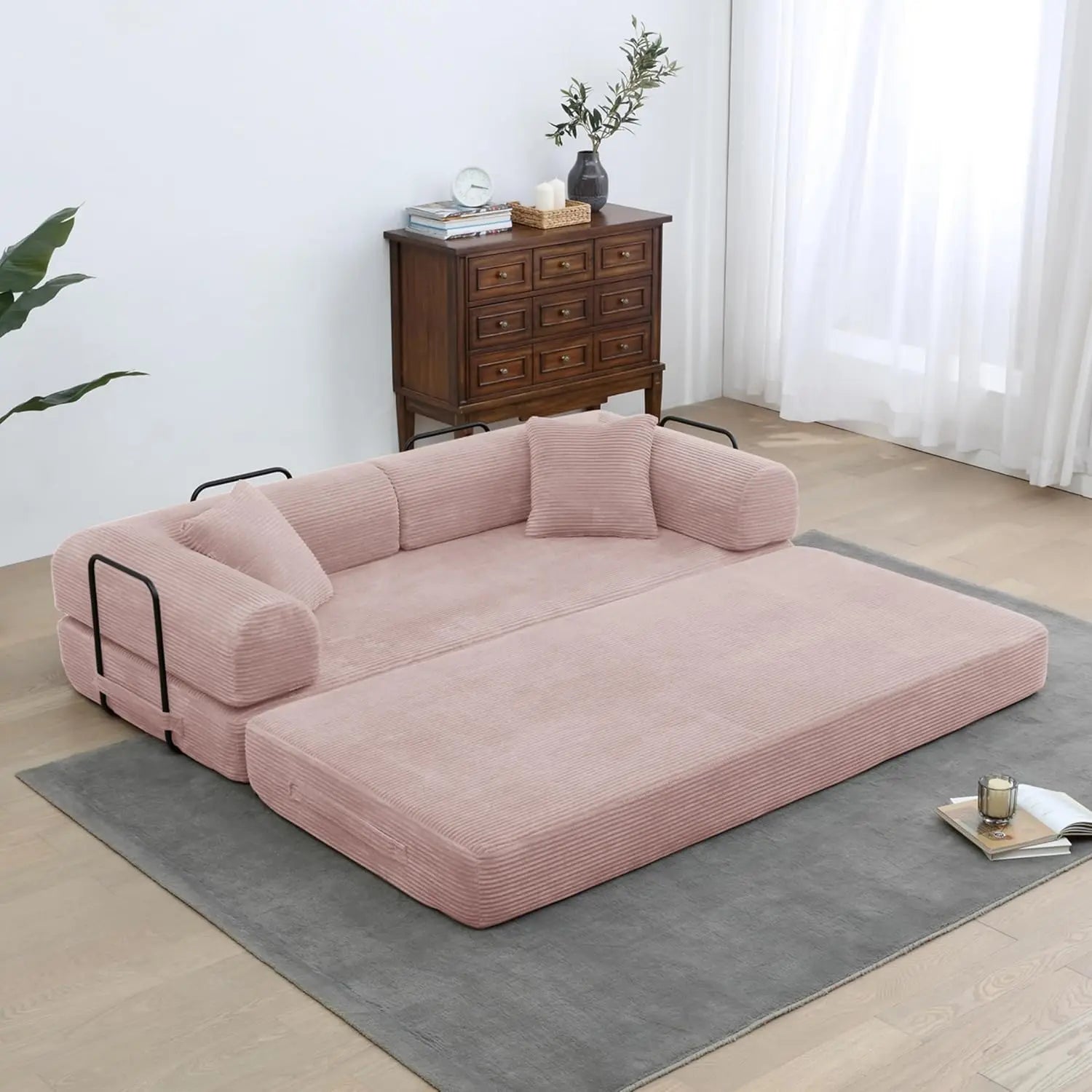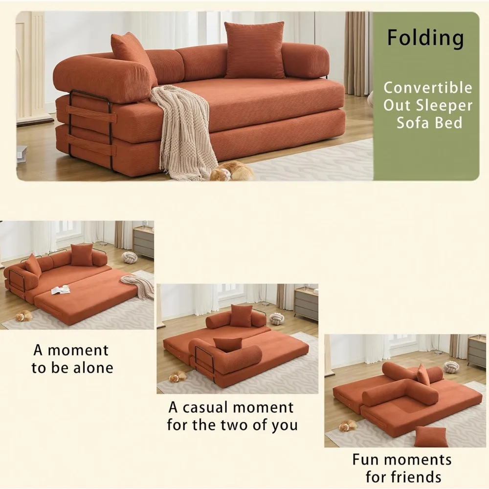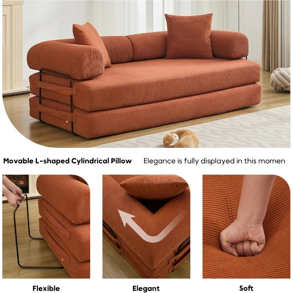 Convertible Sleeper Sofa Bed with Cylindrical Pillow, Corduroy Folding Mattress Couch with Fixed-Shape Frame, Floor Sofa Lounge