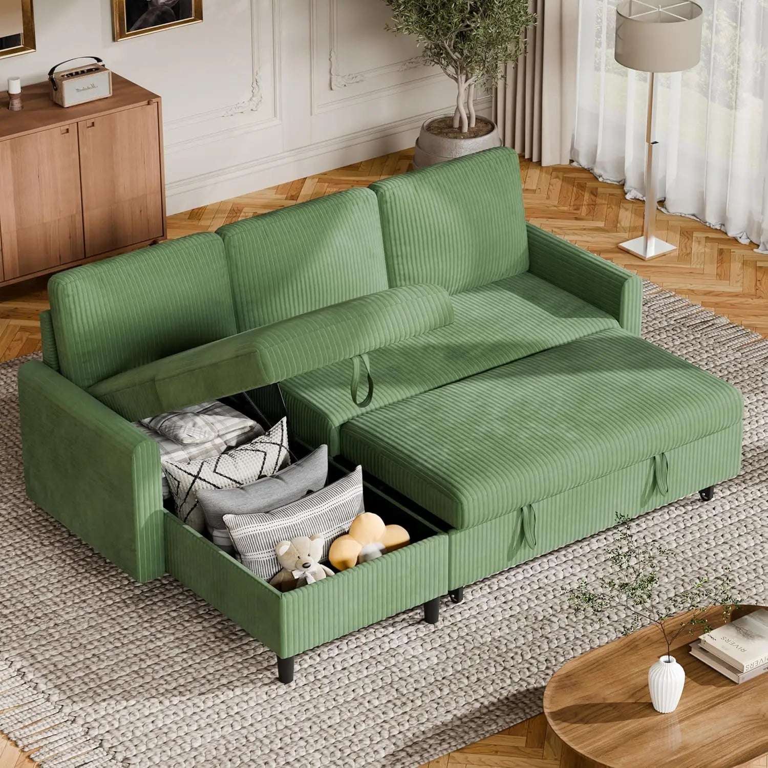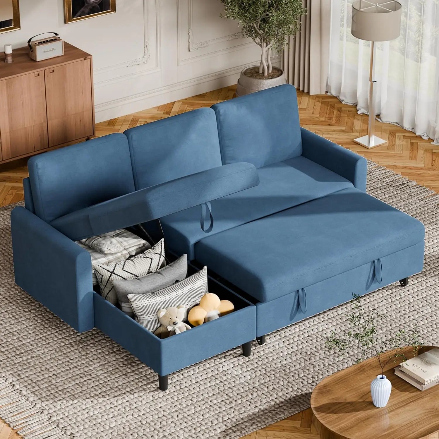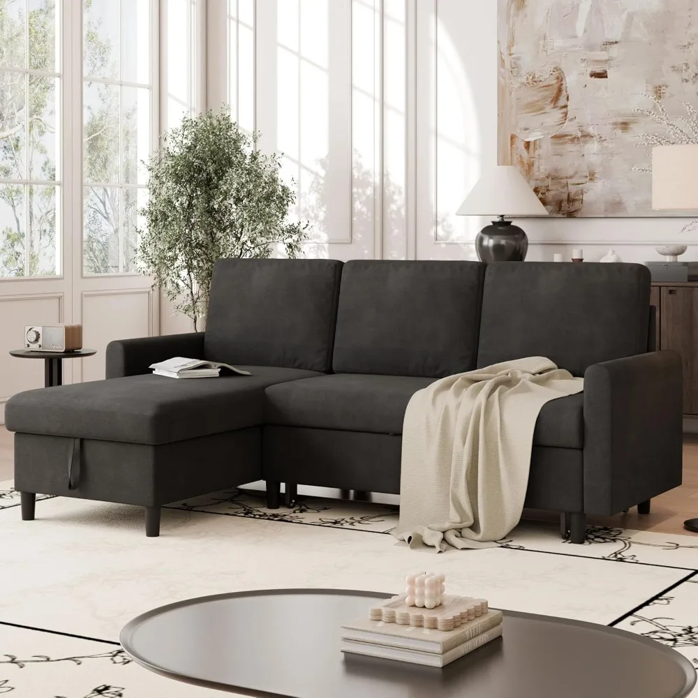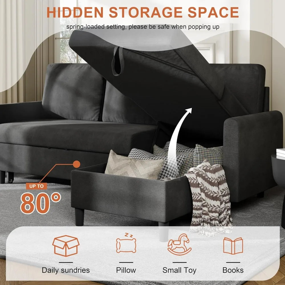Convertible Sleeper Sofa, Pull Out Couch with Storage, 77" L-Shaped Sofa Bed with Storage Chaise Linen Fabric for Living Room