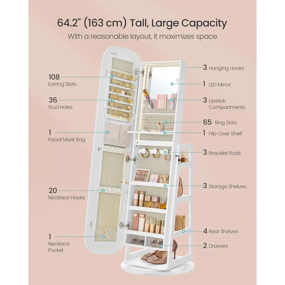 - 【MASSIVE STORAGE】108 earring slots, 36 stud earring holes, 20 necklace hooks, 65 ring slots, 3 bracelet rods—the jewelry jungle ends in this standing mirror jewelry cabinet. Plus, there are 3 compartments, 2 drawers, 4 shelves, and a bag for your makeup!