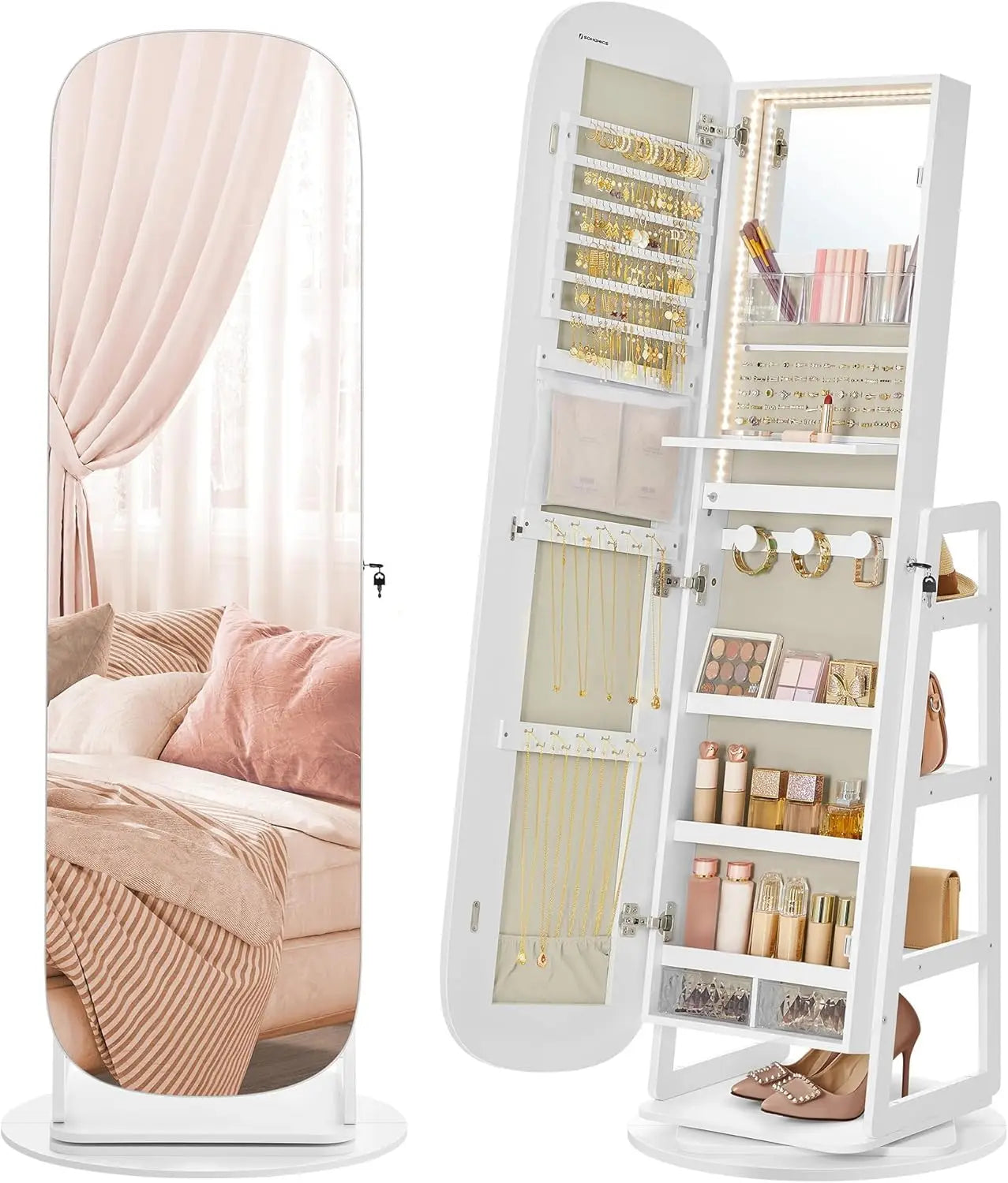 LED Jewelry Cabinet, 360° Swivel Jewelry Organizer, Lockable Mirror Jewelry Cabinet Standing, Rounded Wide Full-Length Mirror