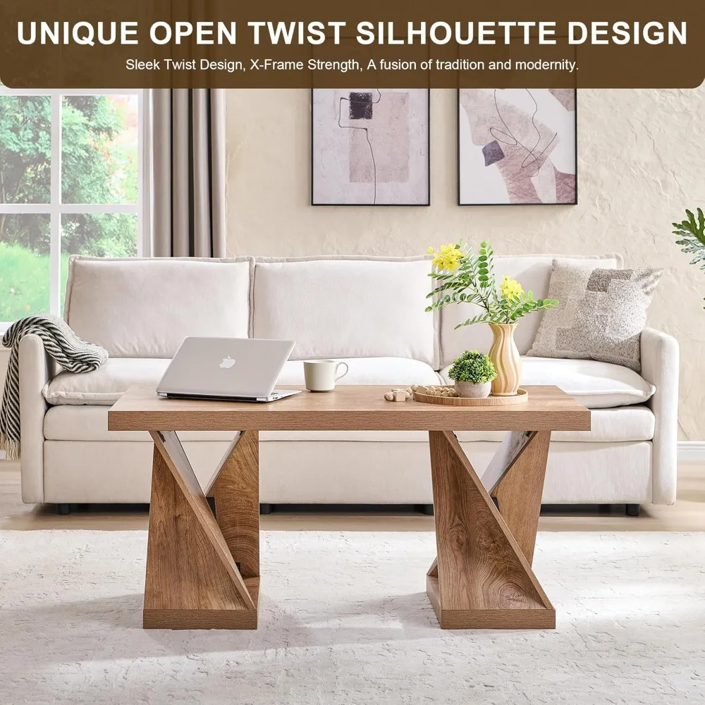 - Versatile, Stylish Table: Measuring 48"L × 22"D × 24"H.This coffee table combines style and practicality.,22" wider tabletop, provides you with a tabletop area for eating, watching a movie, or working from home on your laptop. This unique twisted modern coffee table it not only keeps your living room tidy, but also complements the surrounding furniture and décor themes ranging from modern to rustic styles, giving a warm and inviting feeling to gather your family around and enjoy the warm and intimate atmosphere.