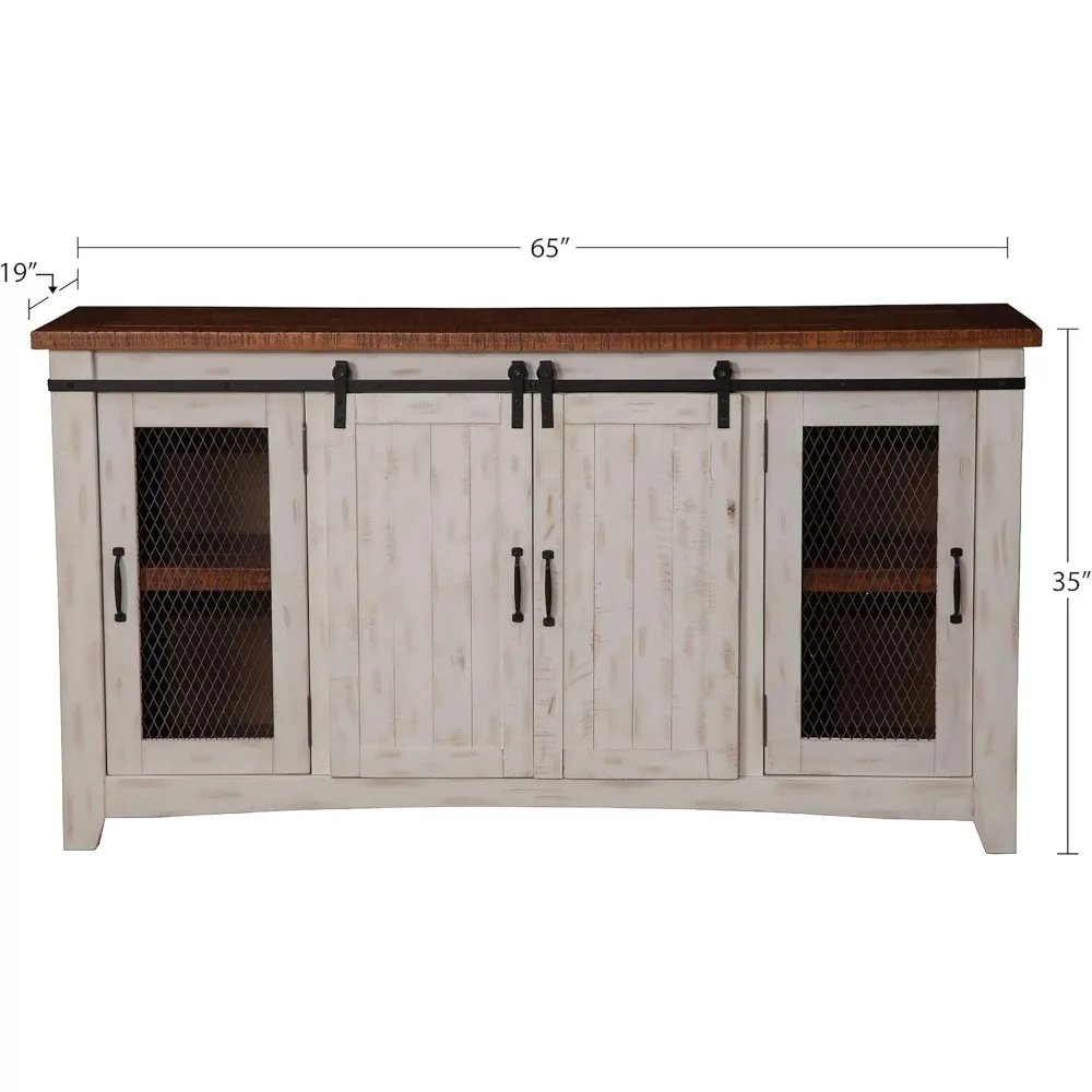 - RUSTIC DESIGN WITH A MODERN TWIST – Crafted from solid pine wood and pine veneers, this 65" TV stand boasts a natural distressed finish that blends effortlessly with rustic, farmhouse, or industrial décor. Metal mesh-style doors add the perfect touch of rustic charm. Ever versatile, this piece doubles as a dining room server, credenza, or sideboard.
