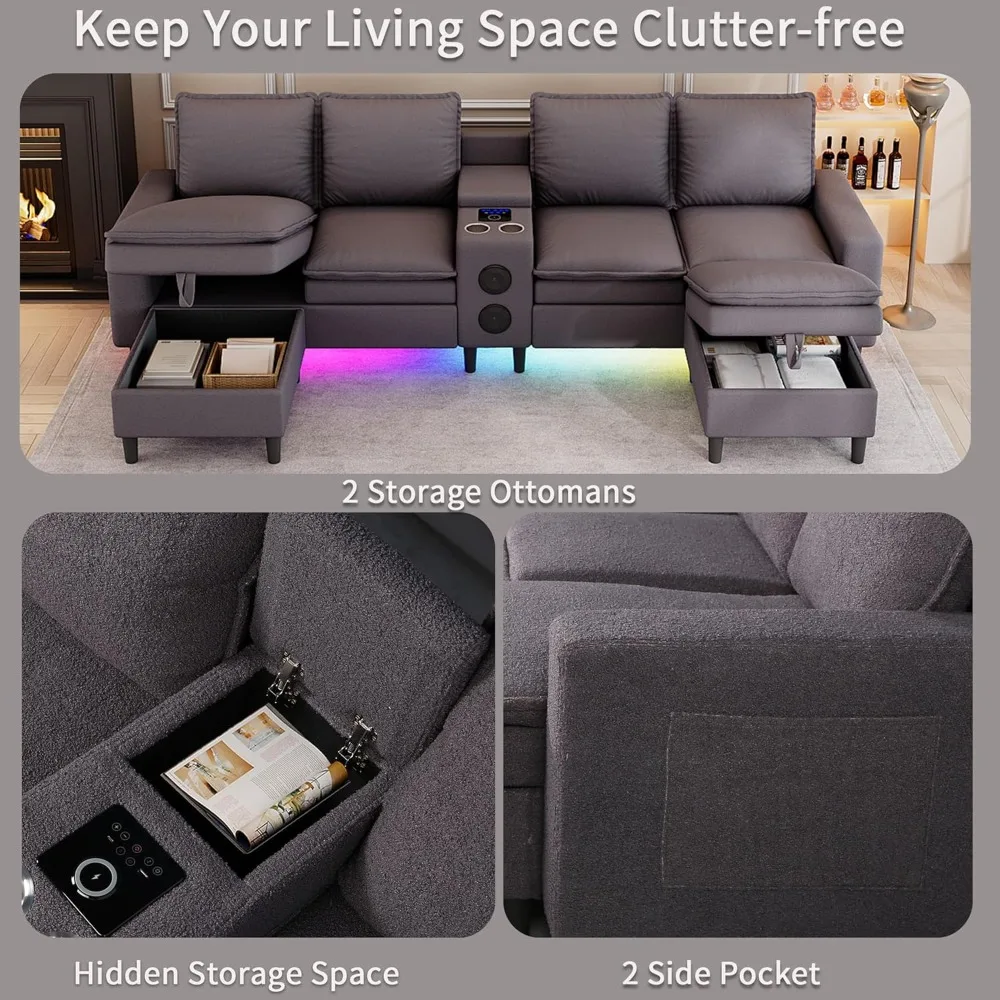 - 【Couch with Storage & Charging】The oversized couch comes with 2 movable storage ottoman, 2 side pockets, 2 cup holders and a hidden storage box, which provide practical space to storage remotes, magazines or anything you need to keep your room neat. It also features wireless charging station, 1 USB and 1 Type-C charging port, allowing you to charge your electronic devices while you indulge in your favorite movies—ensuring both convenience and comfort while you relax
