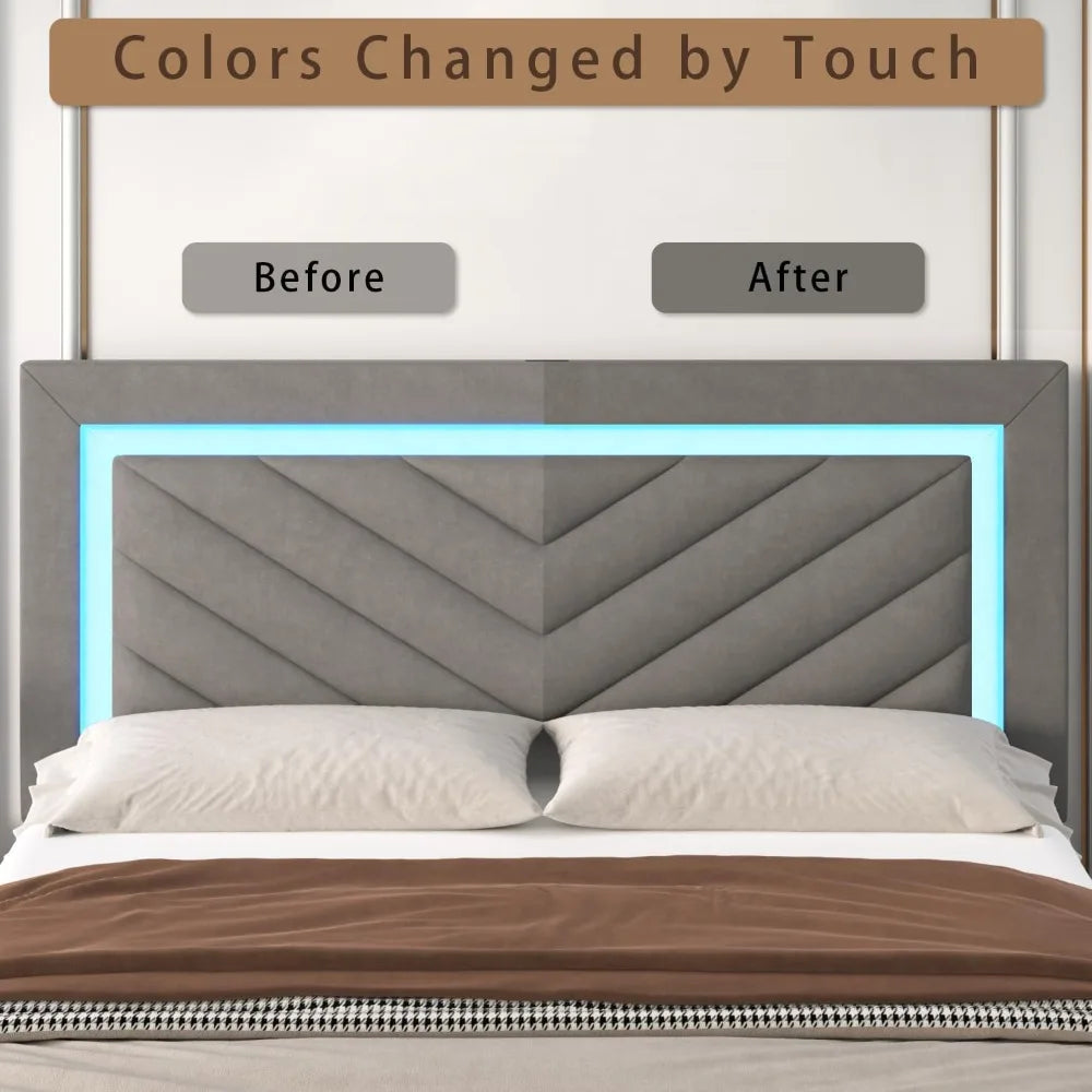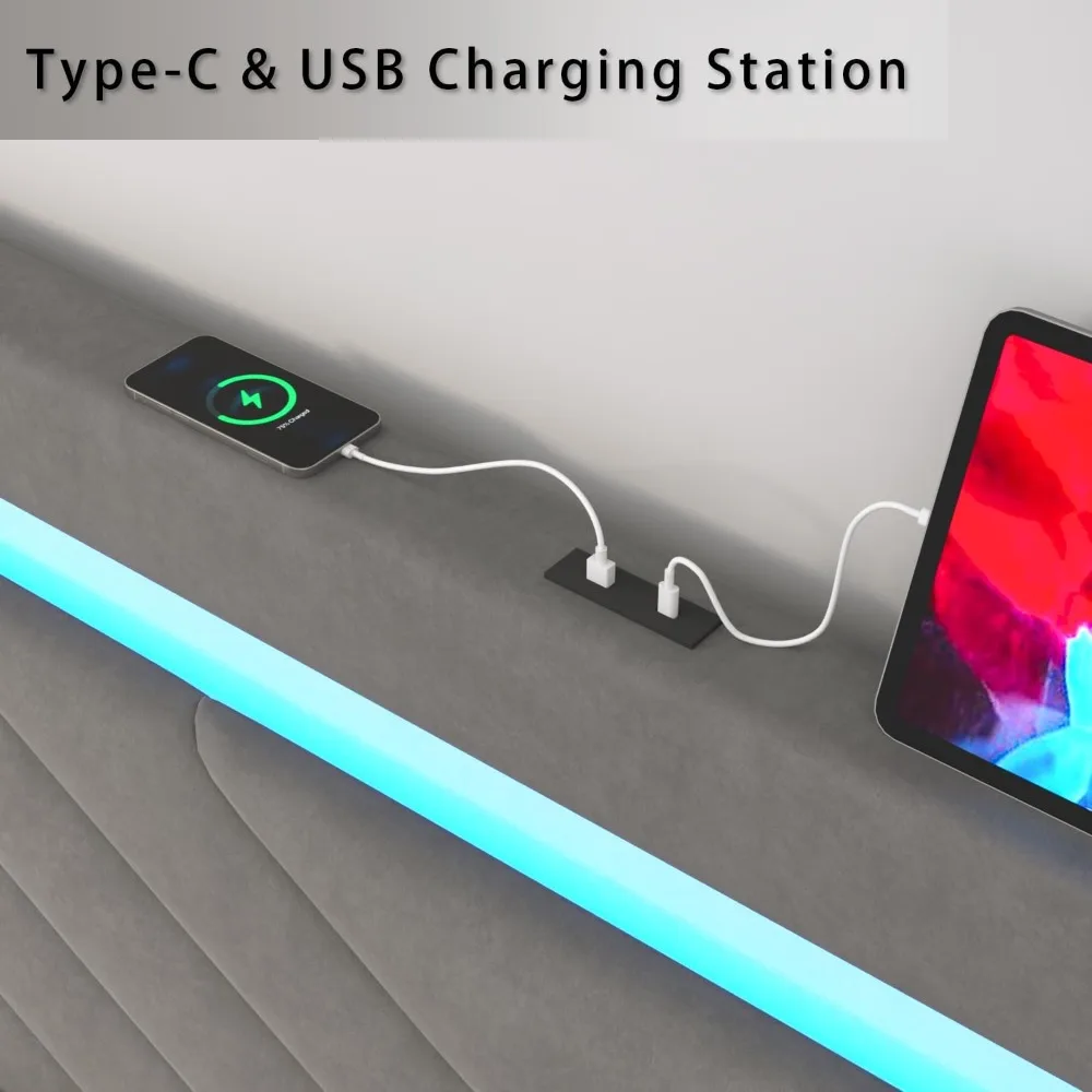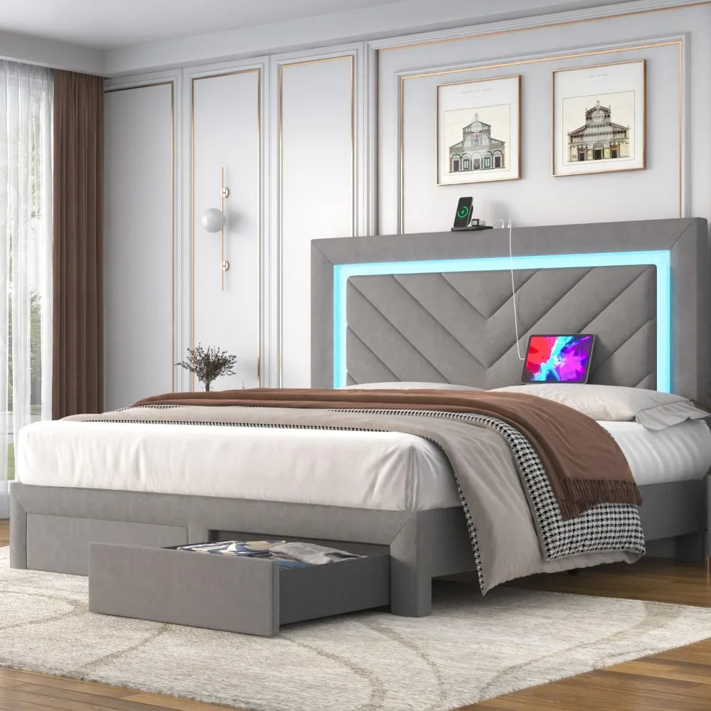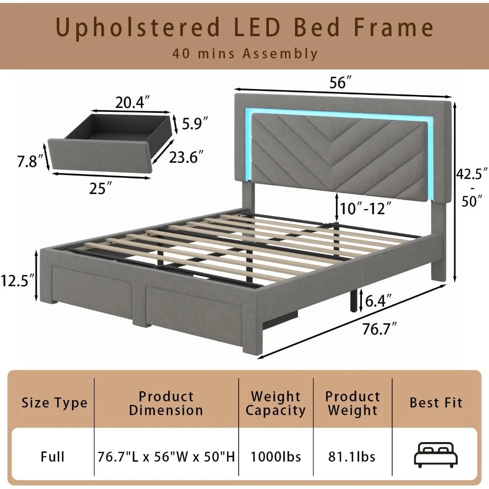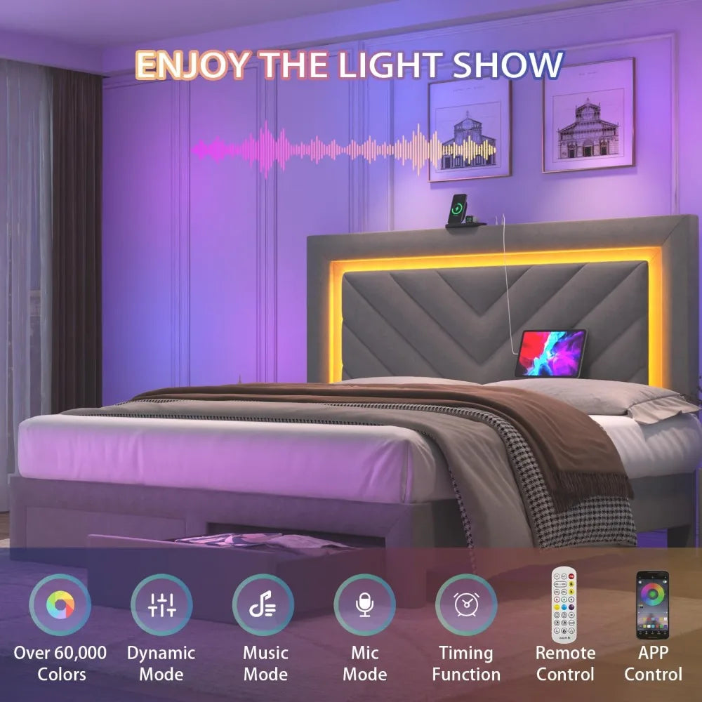Upholstered Full Bed Frame with LED Headboard and Storage Drawer, Velvet Platform Bed Frame Full Size with Charging Station