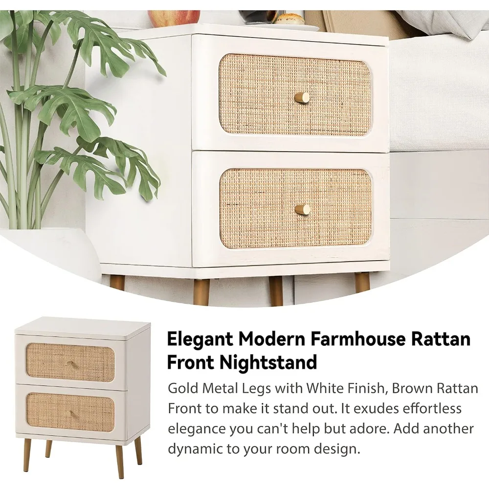 Wicker Rattan Nightstand Set of 2, 2-Drawer End Table White Finish Side Table for Small Spaces, Modern Farmhouse Wooden